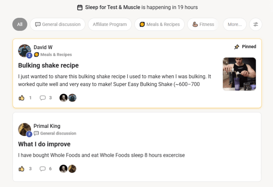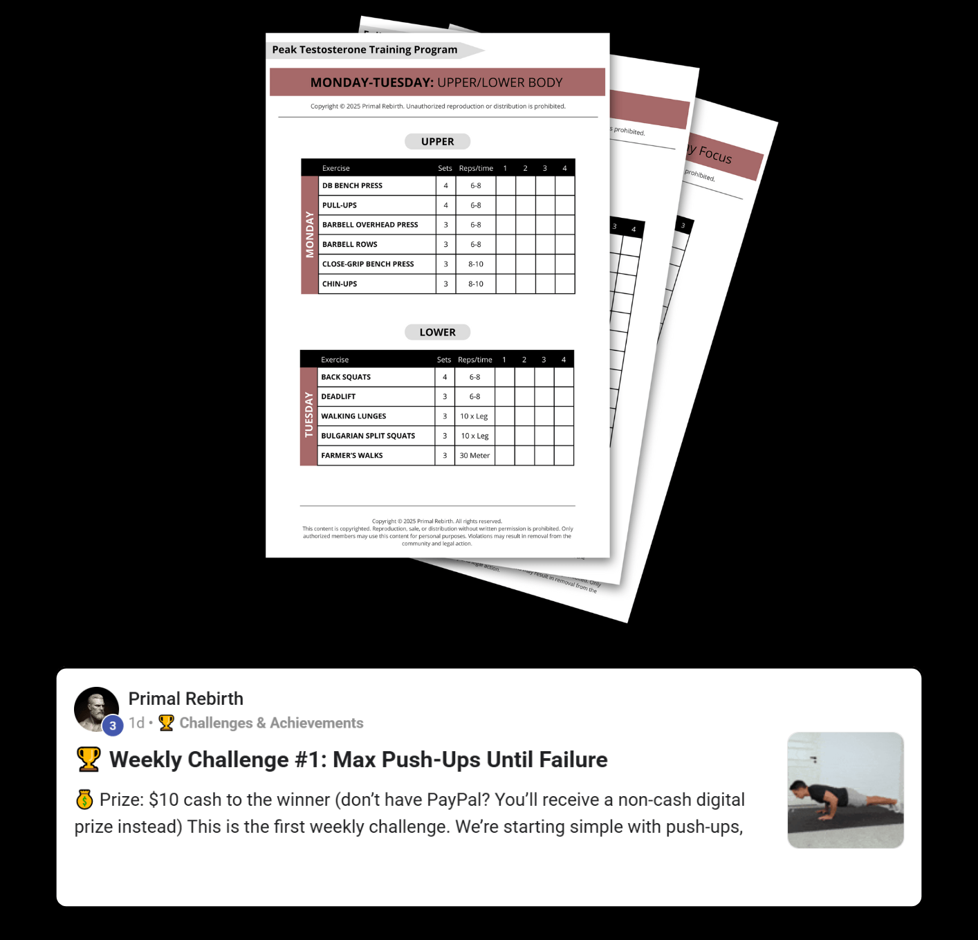 Workout plans designed for muscle and testosterone optimization, plus weekly challenges where members compete for $10 PayPal prizes.